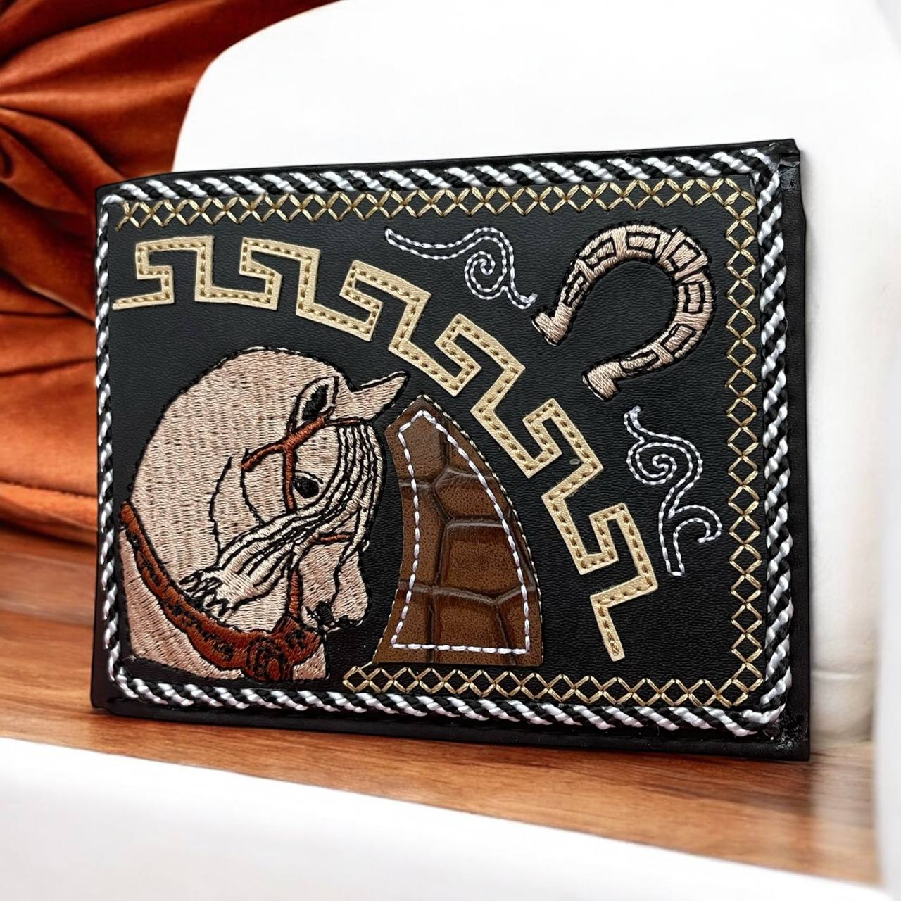 Cartera estilo vaquero elaborada con materiales resistentes y acabados artesanales, pensada para quienes buscan un accesorio duradero, funcional y con personalidad. Su diseño bordado y detalles cuidadosamente trabajados le dan un estilo auténtico y elegante.