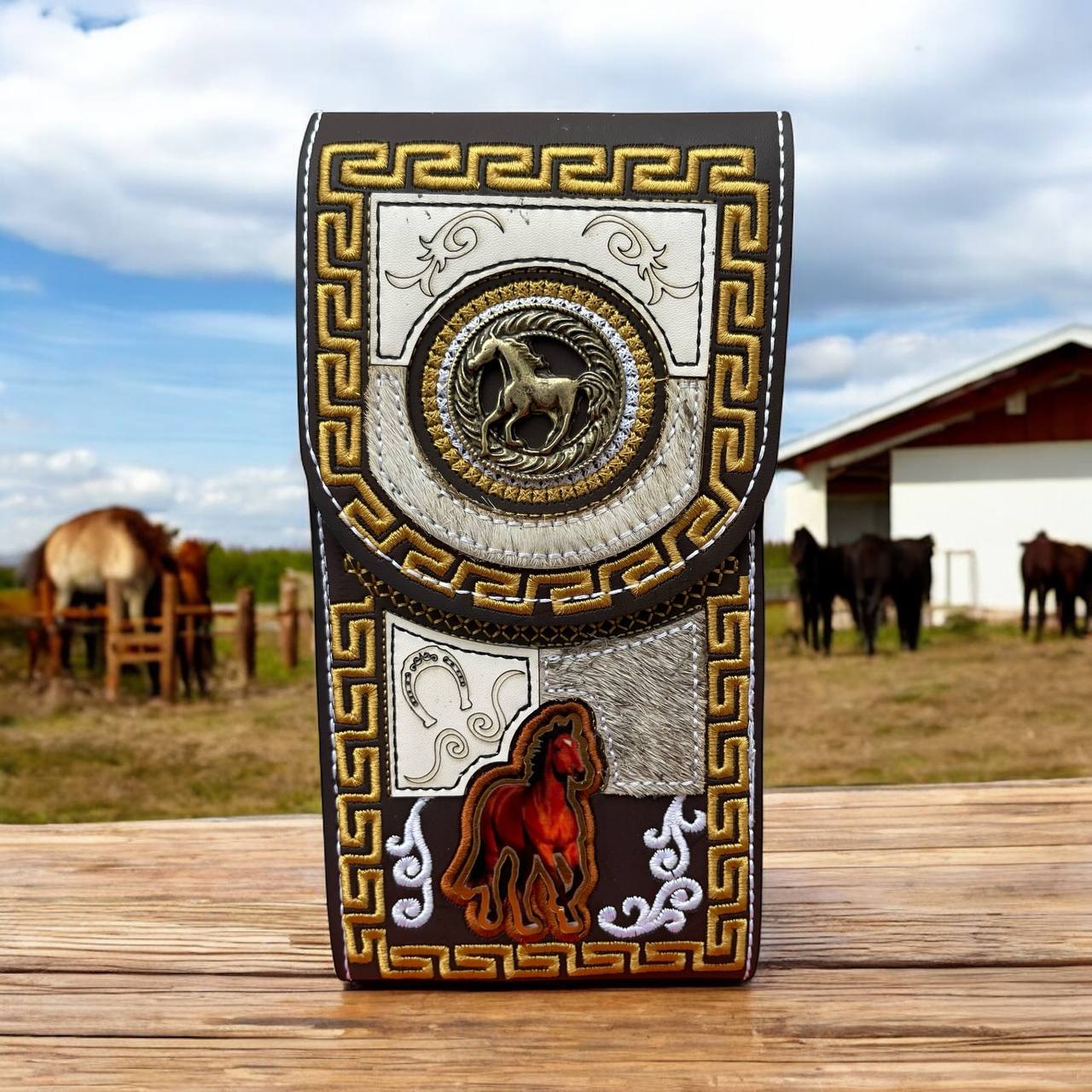 Funda para celular con diseño vaquero bordado, elaborada con materiales resistentes y acabados de alta calidad. Brinda protección y estilo en un solo accesorio, ideal para quienes buscan algo diferente y elegante.